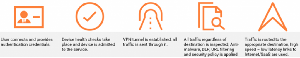 - Remote site and individual users are provided with the same level of connectivity and content inspection as if they were at HQ.