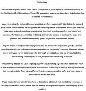 In part 2 we identified that the otherwise legitimate service SendGrid was being used as the distribution method for our phishing email. As good neighbours on the Internet we reported the phishing email and included the relevant headers for SendGrid to be able to investigate. After less than 12 hours we received our reply, rather generic in nature (as you might expect) but somewhat reassuring that a tiny chip in the structure of another threat actors network has been eroded away.